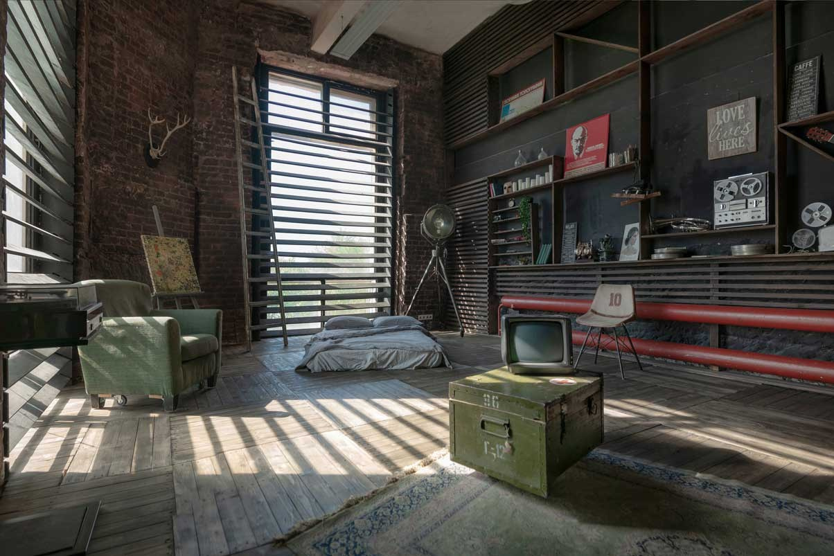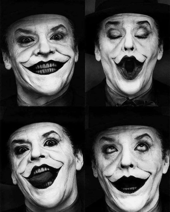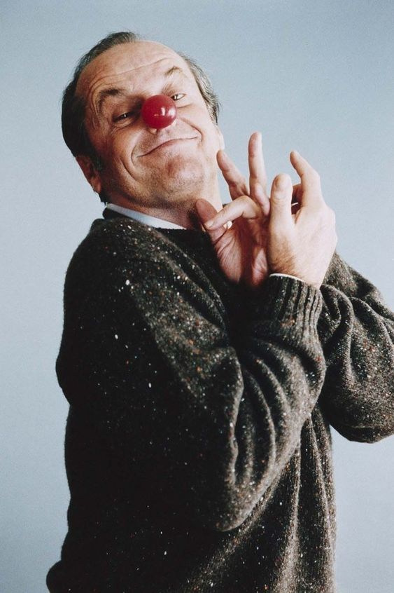 Белая майка-алкоголичка или белая футболка (немного растянутая), брюки (можно с подтяжками), всклокоченные волосы. Возможно, галстук-бабочка. Образ неряшливый. Лицо выбелено (будет снят процесс накладывания грима). Выражение лица страдальческое, несчастное, с клоунскими гримасами.