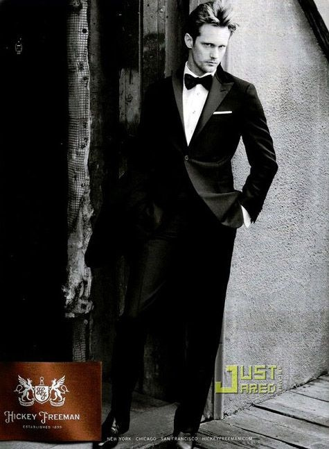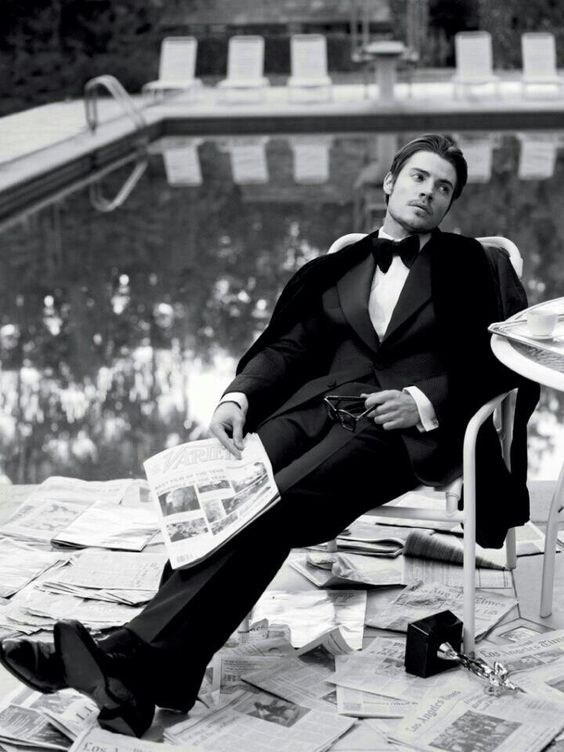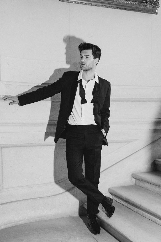 Смокинг, галстук-бабочка (развязан), классические черные ботинки.